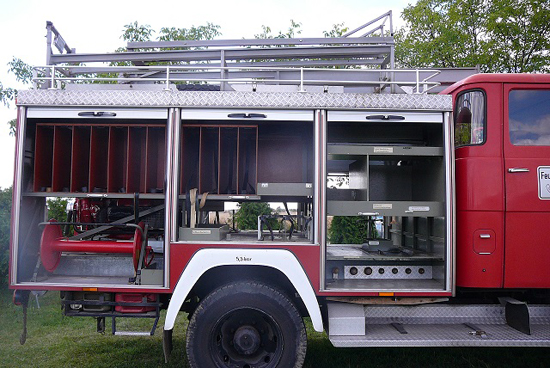 - w przedziale bagażowym przegrody i wysuwane szuflady na sprzęt pożarniczy,